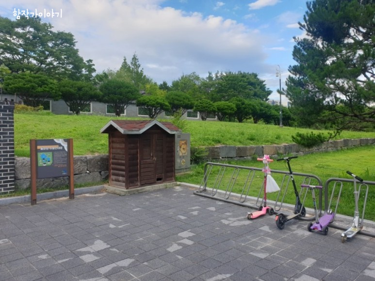 저는 수원효원공원에 온 것이 아니고, 월화원을 보기위해서 왔습니다. 계단 앞에는 자전거나 유모차, 킥보드를 두는 곳이 있습니다. 안에는 가지고 들어갈 수 없으니 참고해주세요. 애견반입도 안됩니다.
