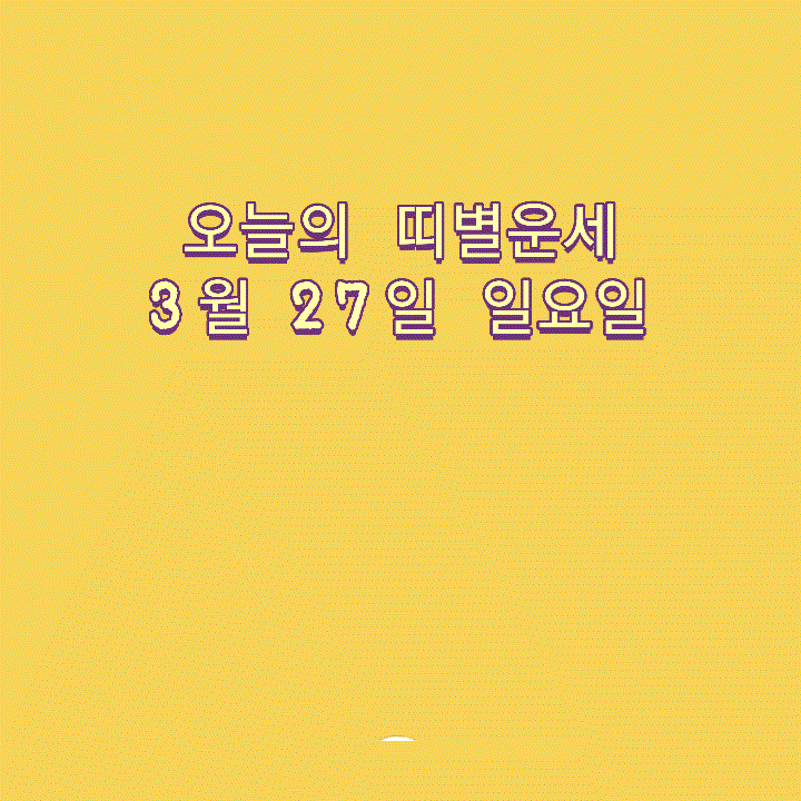 3월 27일 [음력 2월 25일] 일진 오늘의 띠별 운세 소식을 알려드립니다. ■ 쥐띠 96, 84년생 충동적이 되기 쉬우니 오늘은 말과 행동에 특별히 신중해라. 72년생 돌다리도 두들겨 보고 건너라. 무엇보