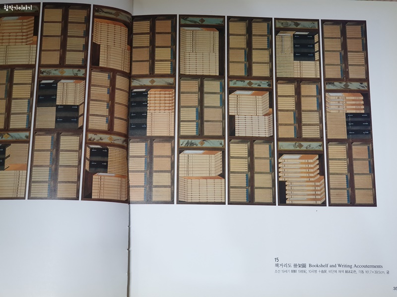 높게 쌓아놓는 책더미와 서재의 여러가지 일상용품을 적절하게 배치한 정물화물 그림으로 전통 장식화, 민화에서 중요한 부분을 차지하는 책거리라 지금까지 꾸준하게 사랑받는 작품인듯 합니다.