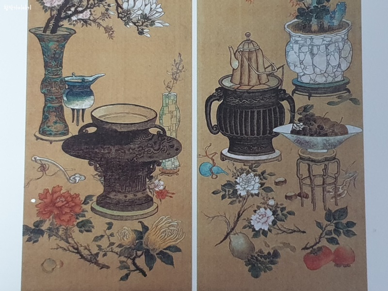 기명절지도는 엷은 담채를 주로 사용하여 맑고 담백한 느낌이 납니다. 소재는 책가도와 느낌이 비슷하지만 기법은 많이 다릅니다. 책가도는 색이 다소 진하게 올라가지만 기명절지도는 담채로 연하게 올라갑니다. 상하로 배열이 된 독특한 구도, 음영법에 의한 입체감, 정교한 공필법과 채색법 등을 통해서 장식적이고, 환상적인 화면을 보여주는데요. 이러한 기명절지도는 중국의 원대부터 서서히 나타나기 시작하면서 청대 후기부터는 독립된 화목으로 그려졌습니다.