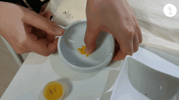 가루를 만든 후에는 아교물을 넣어줍니다. 한번에 많이 넣어주지 마시고, 조금씩 개어주면서 넣어주세요.