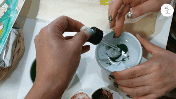 가장 먼저 분채를 손가락을 이용해 부셔줍니다. 덩어리가 있으면 나중에 개어줄 때 덩어리가 생길 수 있으니 최대한 가루로 만들어주세요.