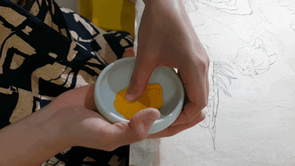 분채를 사용할 때는 물감을 만들 분채물감과 야교가 필요합니다. 아교는 알아교로 되어 있기 때문에 물아교를 먼저 만드셔야하고, 그걸 분채에 넣어 사용을 합니다.