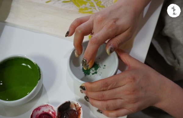 가장 먼저 분채를 손가락을 이용해 부셔줍니다. 덩어리가 있으면 나중에 개어줄 때 덩어리가 생길 수 있으니 최대한 가루로 만들어주세요.