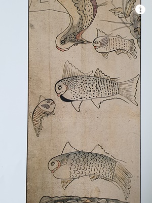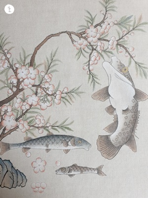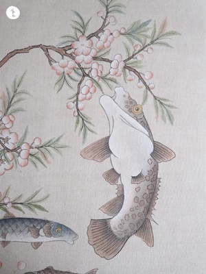 수많은 작은 물고기 떼는 자손번창의 염원이 들어나 있고, 물 위로 솟구쳐 오르는 잉어 그림에서는 과거 급제나 임신출세의 욕망이 담겨져 있습니다.