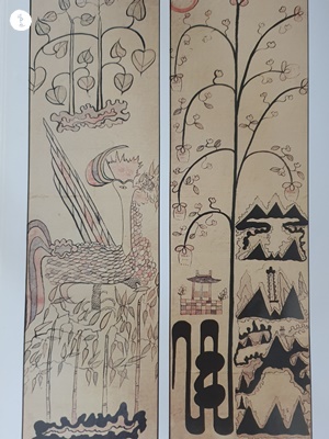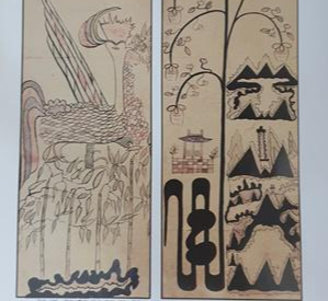 신 그림에는 파랑새과 흰 기러기가 편지를 입어 물고 있는데, 이 새들이 물고 있는 편지는 언약과 믿음을 상징을 하며, 예 그림은 하도낙서 고사와 관련되어 등에 책을 지고 있는 거북이가 등장을 합니다. 하나라 오왕 때에 낙수에서 나온 대법의 기원이 되었다고 합니다.