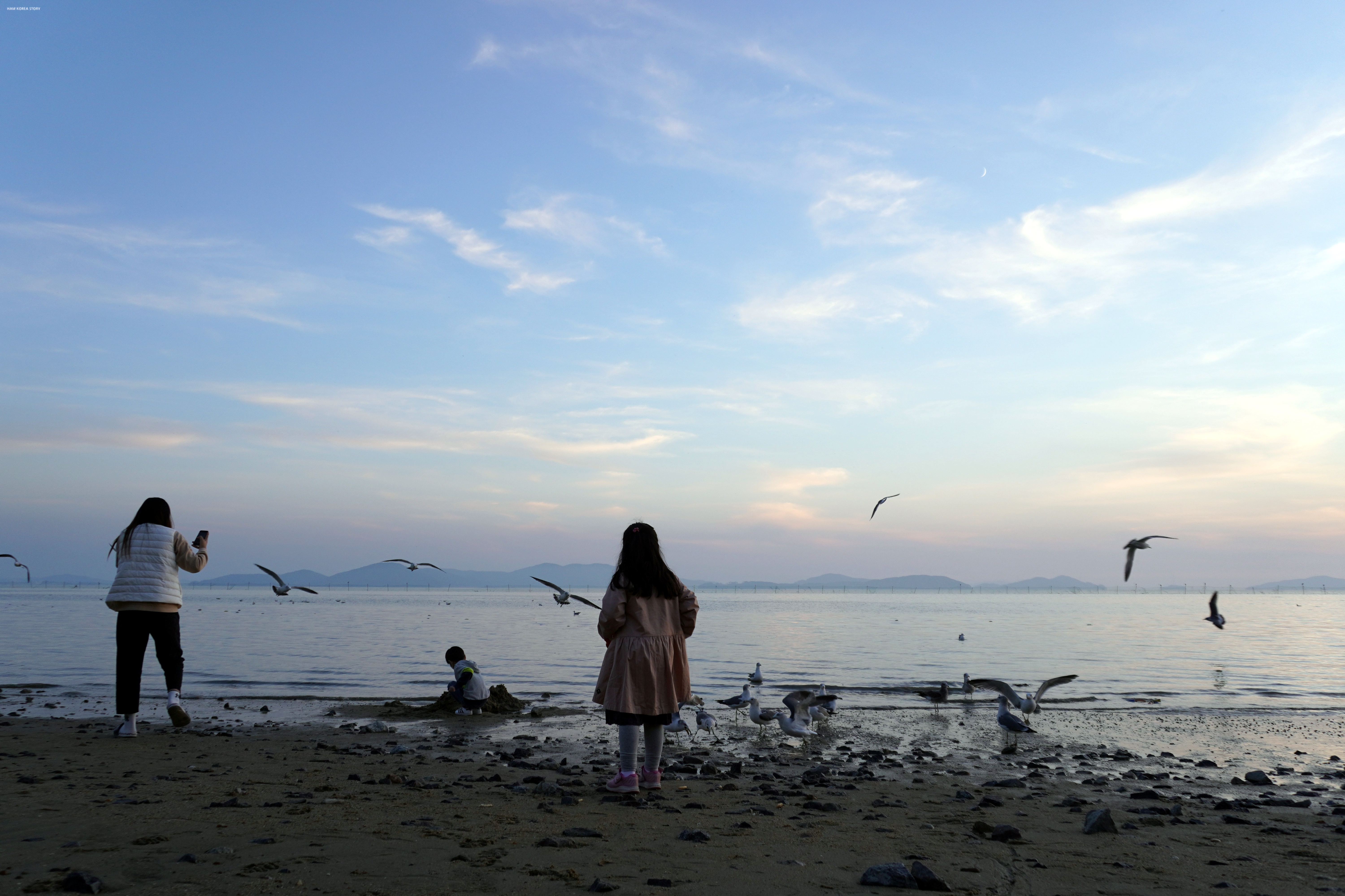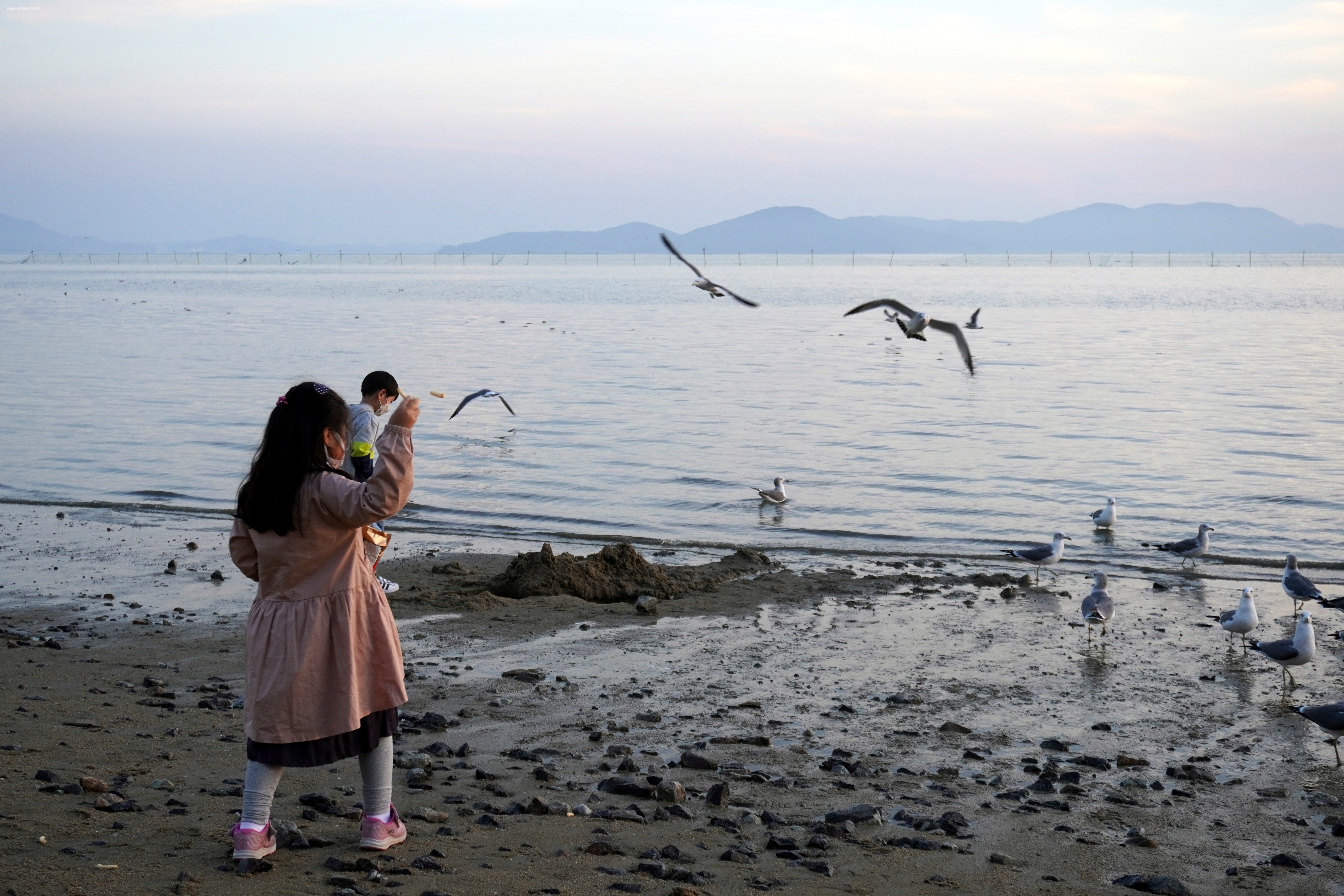 갈매기가 가까이 들어와도 아무렇지 않은 딸.