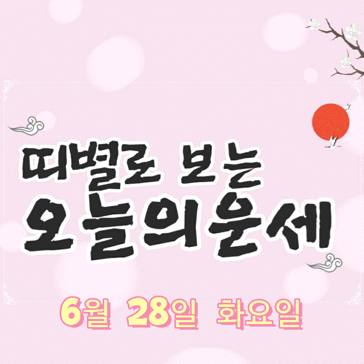 50년생 서운한 감정을 바람에 실어내자.62년생 약해지는 마음을 다 잡아줘야 한다.74년생 슬픔은 이제 그만 희망이 보여 진다.86년생 싸고 좋은 것에 의심을 가져보자.98년생 원리를 알았으면 실천에 옮겨가자.