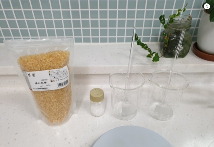 뜨거운 물에 잠시 두면 스르륵 다 녹습니다. 아교는 뜨거운 물에 처음부터 녹여도 되긴 하지만 바닥에 들러붙어 녹이는 과정에서 더 불편하기 때문에 저는 미리 불려두었다가 사용을 합니다.