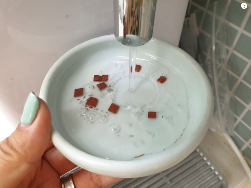 뜨거운물을 넣으면 이렇게 살짝 색이 변하면서 물감이 풀어지는 모습이 보이는데, 금방 풀리는 것이 아니기 때문에 그림그리기 전에 바로 하기 보다는 전날 편채에 뜨거운 물을 담아두고 먼지가 안들어가게 덮어두는 것이 좋습니다.