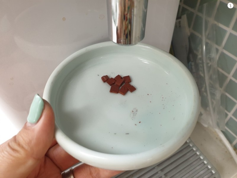 뜨거운 물을 접시에 담아주는데, 동양화물감이 살짝 잠길정도만 넣어주세요. 너무 많이 넣으면 물이 너무 많아져서 물감이 연해집니다. 그렇기 때문에 물감이 녹을 수 있을 정도만 넣어주시면 됩니다.