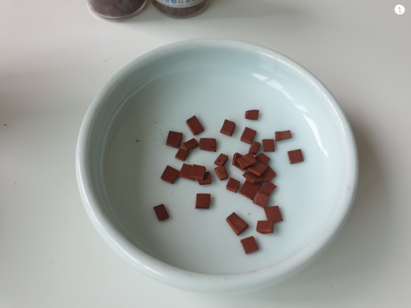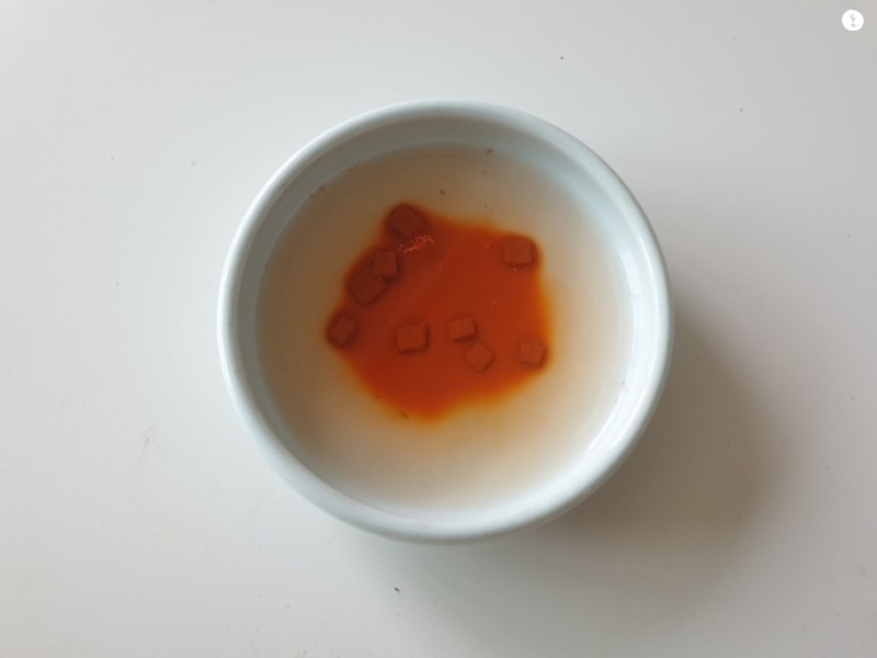 뜨거운 물을 접시에 담아주는데, 동양화물감이 살짝 잠길정도만 넣어주세요. 너무 많이 넣으면 물이 너무 많아져서 물감이 연해집니다. 그렇기 때문에 물감이 녹을 수 있을 정도만 넣어주시면 됩니다.
