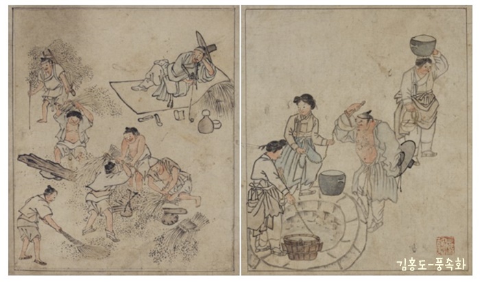 <타작>과 <우물가>. 등장 인물들의 살아있는 듯 한 표정과 행동으로 그림 속에 이야기를 배치해 놓았습니다.