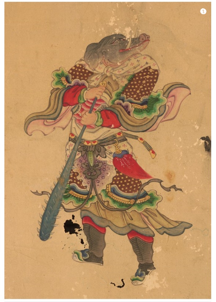 사람의 몸에 무기를 들고 있으며 돼지의 머리가 결합되어 있습니다. 갑주를 입고, 뾰족한 쇠가 숭숭 박힌 공이 모양의 방망이를 들고 있으며, 눈은 부리부리하고 두 어금니는 입 밖으로 치켜 올라가 늠름하면서도 사나운 느낌을 주고 있습니다. 약사여래도에서 십이신장은 머리와 몸체 모두 인간의 모습을 하고 있는데, 이 그림 속의 신장은 고대 무덤의 조각상과 마찬가지로 동물의 머리 모습을 하고 있는 것이 특징입니다.