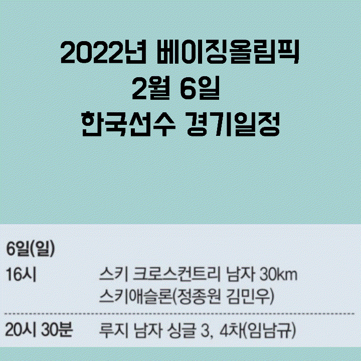 2월 6일 베이징올림픽 한국선수 경기일정에 대해서 알아보았습니다. 오늘은 경기가 많지 않지만 가족끼리 모여 함께 보는것은 어떨까요?