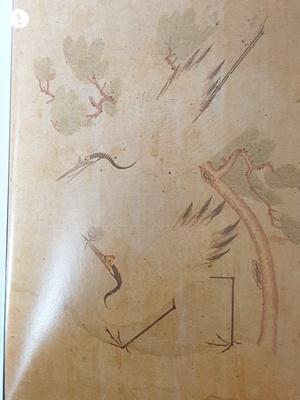 이 그림을 보면 자와 대칭형의 학 그림의 전형을 보여주고 있는데, 매우 균형잡힌 구도에 경직성을 느끼게 하고 있지만 그 경직성을 소나무의 움직임이 강한 율돌감에 의해 어느정도 완화가 되고 있으며, 세방향으로 뻗어가는 형태 구성의 힘에 의해 정지괸 구도의 틀을 넘어서는 조형의 에너지를 느끼게 합니다.